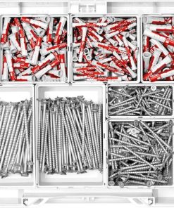 - 3x Einsatzbox 50 x 50 x 68 mm, 2x Einsatzbox 50 x 100 x 68 mm, 4x Einsatzbox 100 x 100 x 68 mm, 2x Einsatzbox 100 x 150 x 68 mm, Fischer DuoPower 2-Komponenten-Dübel:, 100x DuoPower 6×30, 100x DuoPower 6×50, 100x DuoPower 8×40, 50x DuoPower 10×50, SPAX T-STAR plus Universalschrauben WIROX mit Senkkopf:, 50x T-STAR plus 4,5×40 Vollgewinde T20, 100x T-STAR plus 5,0×60 Vollgewinde T20, 100x T-STAR plus 5,0×90 Teilgewinde T20, 50x T-STAR plus 6,0×100 Teilgewinde T30, CENTROTEC Magnet-Bithalter BH 60 CE-Imp, 10x Bit TX 20, 10x Bit TX 30